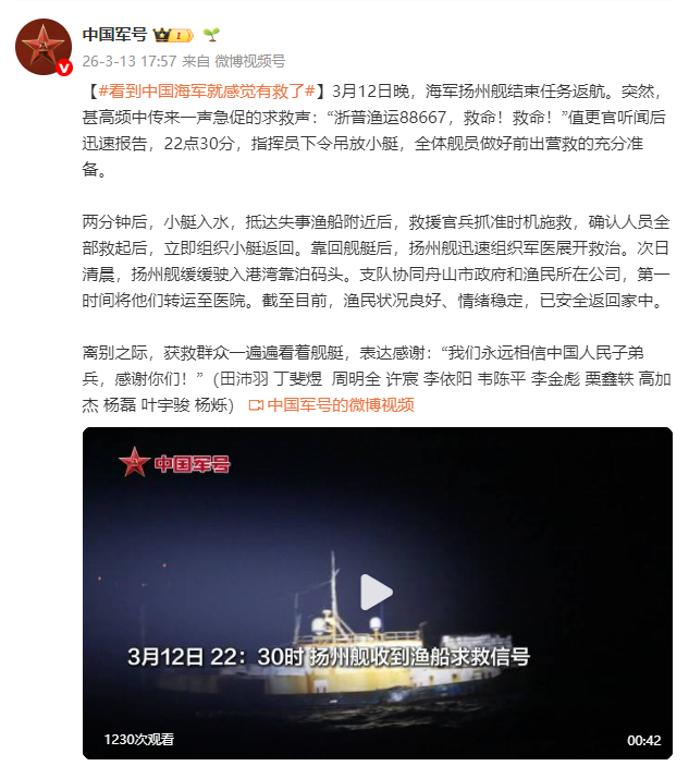 3月12日晚,海军扬州舰结束任务返航。突然,甚高频中传来一声急促的求救声:“浙普渔运88667,救命!救命!”值更官听闻后迅速报告,22点30分,指挥员下令吊放小艇,全体舰员做好前出营救的充分准备。