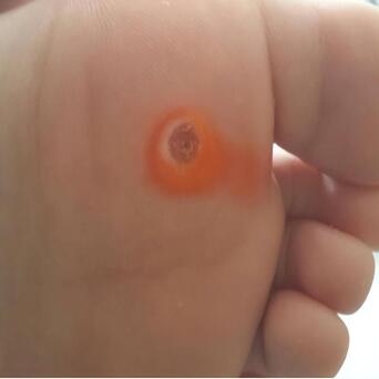 跖疣长在脚底,走路时被体重压着,每一步都像踩了颗小石子在里头。跖疣表面有厚厚的角化层,中央往往能看到黑色小点,那是毛细血管的出血点,是判断跖疣的一个重要参考依据。