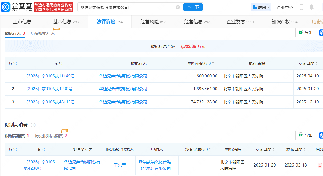 企查查显示,华谊兄弟传媒股份有限公司成立于2004年11月,注册资本约27.7亿元,由王忠军、王中磊等共同持股。风险信息显示,华谊兄弟已被列为被执行人,并被限制高消费。