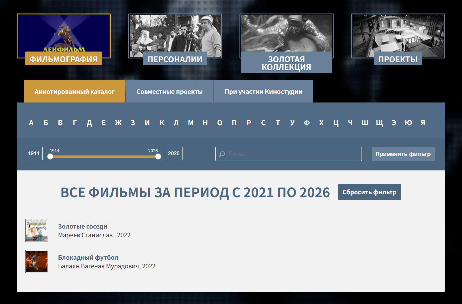 如上图列宁格勒电影制片厂官网所示,2021年至2026年期间,列宁格勒电影制片厂仅在2022年制作了两部电影,而在伟大的卫国战争最为艰苦的1942年,这个数字是五部